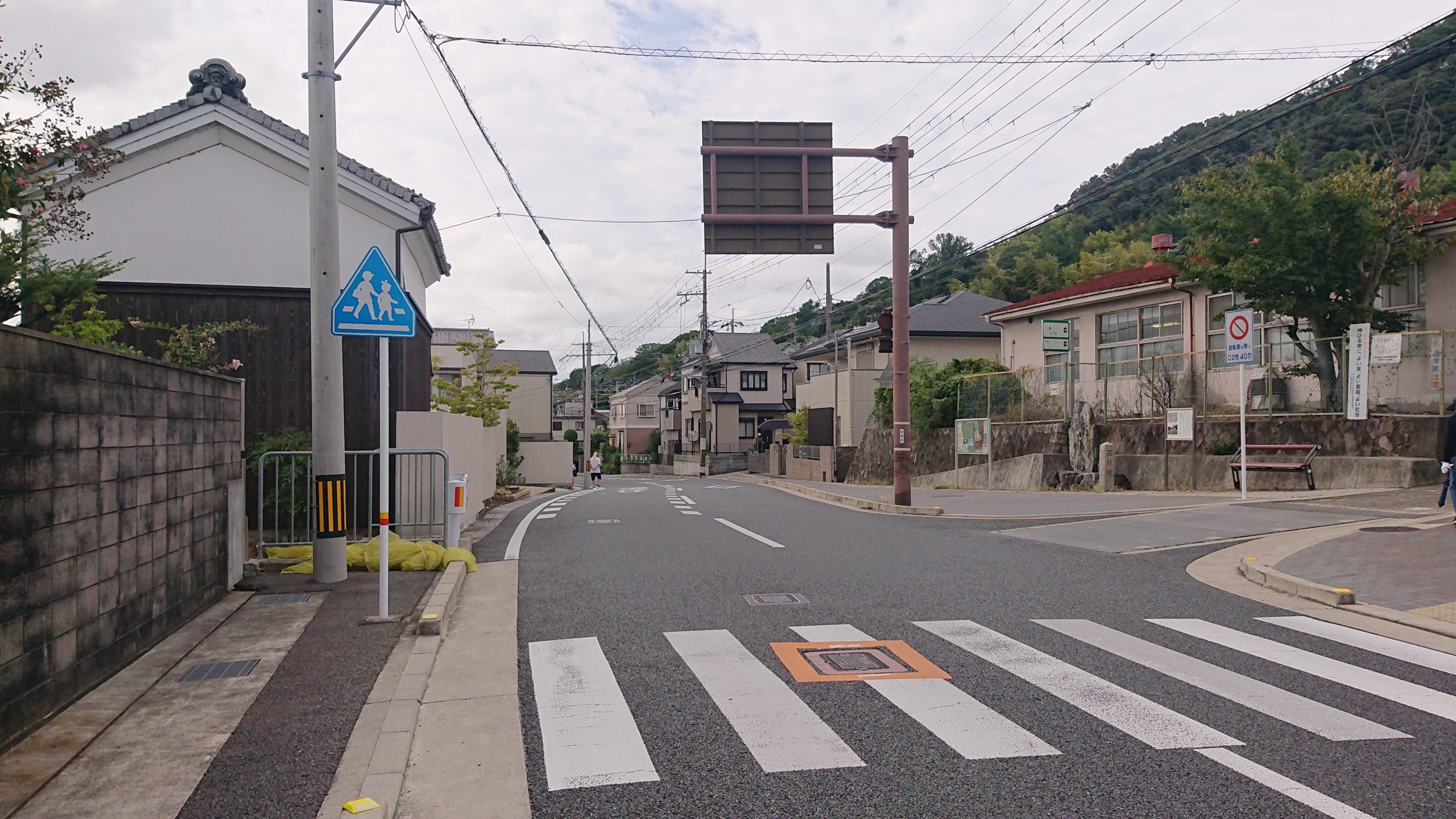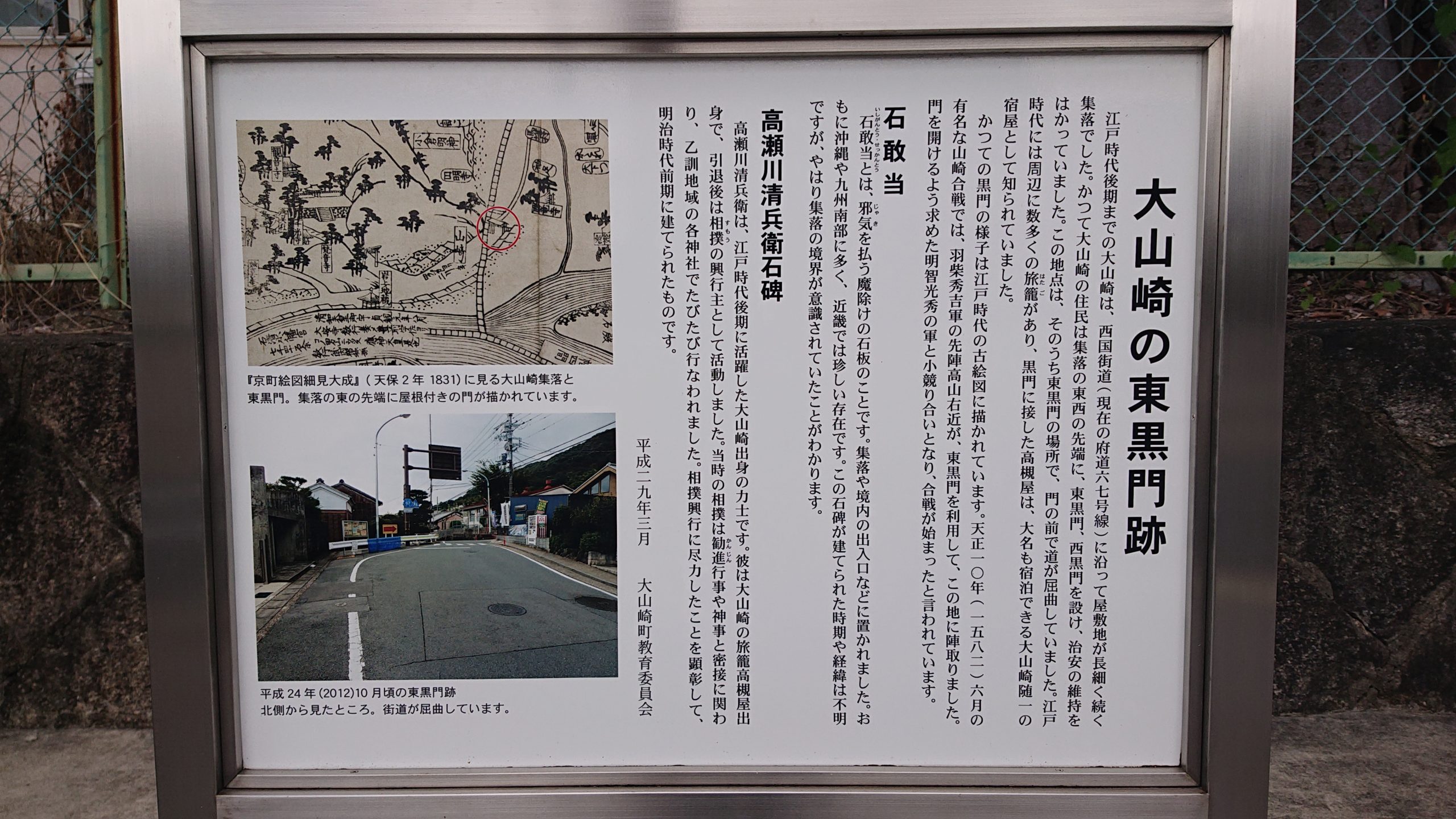 江戸時代後期までの大山崎は、西国街道(現在の府道六七号線)に沿って屋敷地が長細く続く集落でした。かつて大山崎の住民は集落の東西の先端に、東黒門、西黒門を設け、治安の維持を はかっていました。この地点は、そのうち東黒門の場所で、門の前で道が屈曲していました。江戸 時代には周辺に数多くの旅籠があり、黒門に接した高槻屋は、大名も宿泊できる大山崎随一の宿屋として知られていました。