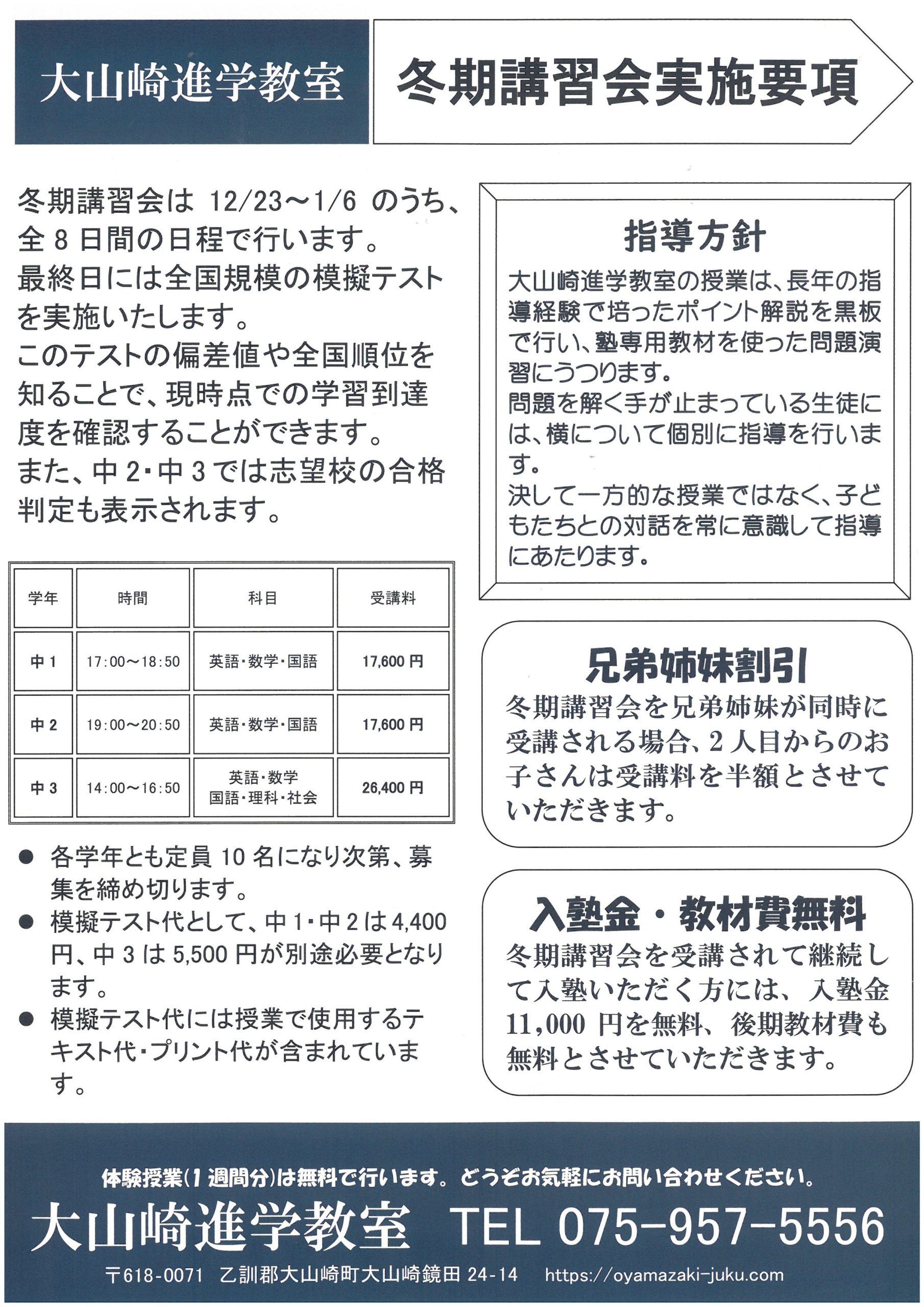 大山崎進学教室の冬期講習会は12/23~1/6のうち、全8日間の日程で行います。